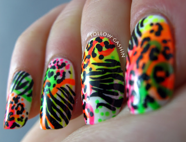 For this look, I started out with a base of Spirit, then painted on various blobs / stripes / dots / curves in the neons. Once dry, I used black acrylic paint for the leopard spots and the... miscellaneous stripes? Not sure what the heck animal I ended up with, there. (It's my very first time doing any kind of animal print; please be gentle.)